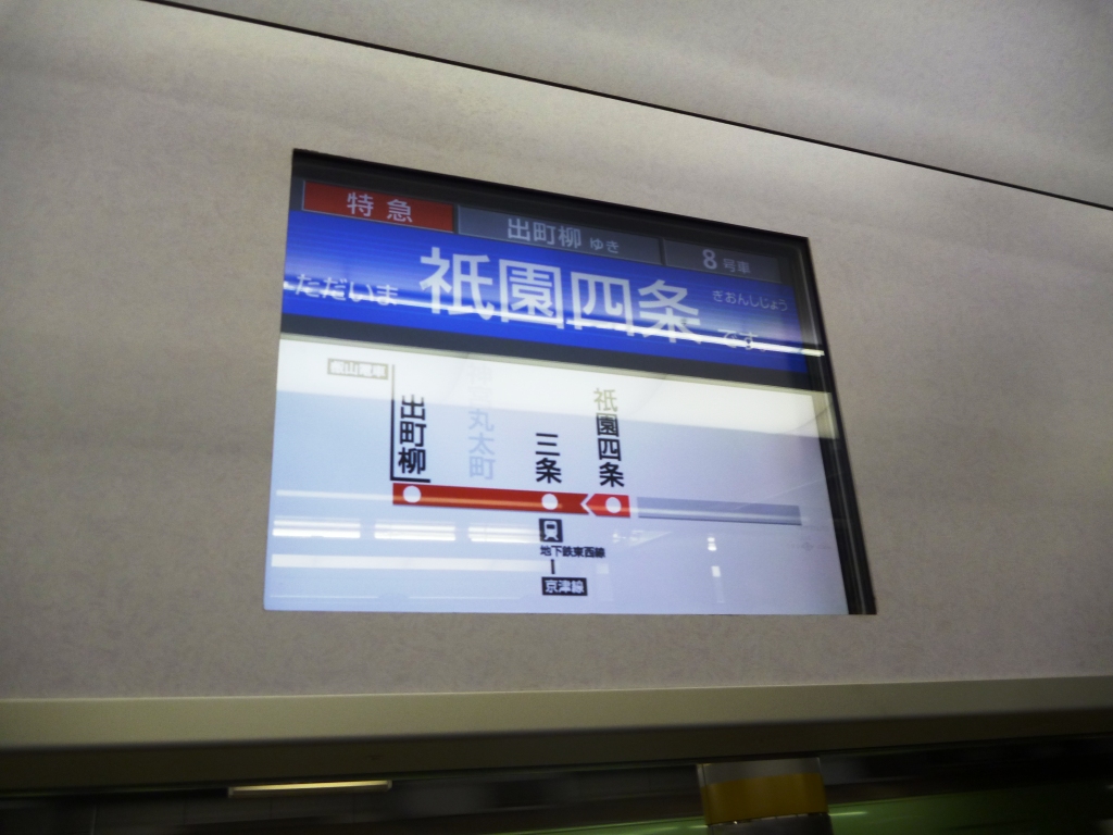▲京阪3000系の液晶画面。天井との境目が写っていますが、非常になめらかです。