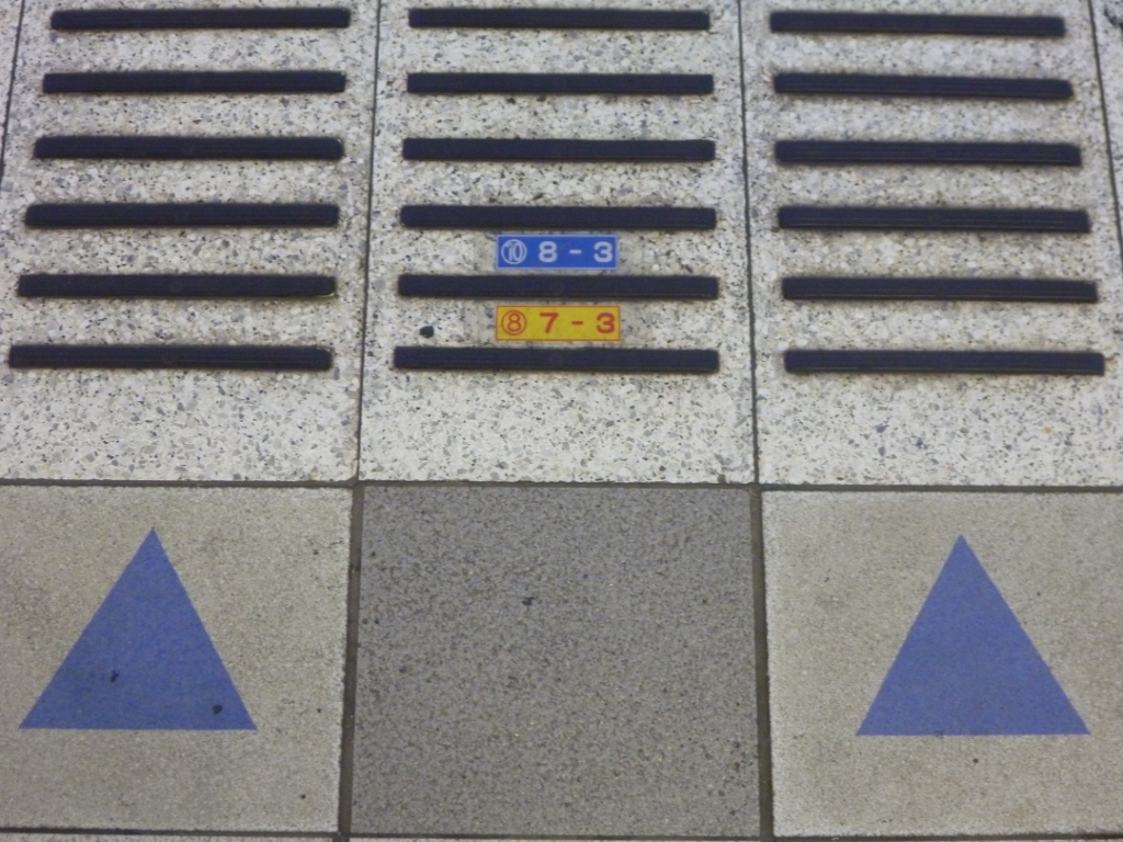 ▲4扉車の乗車位置案内。ホームのタイルに、△が2つ。2列整列を促す印象ですね。