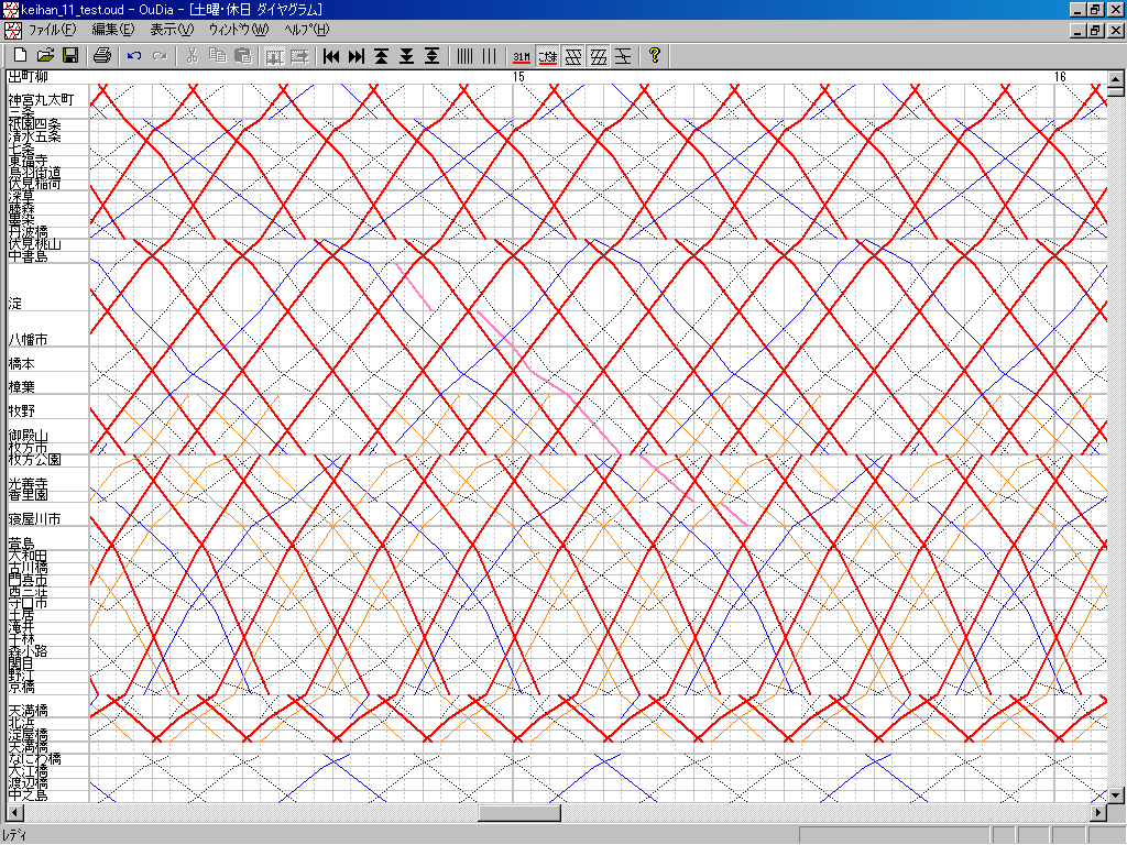 ▲毎度のように、桃色線がこの電車を表します。