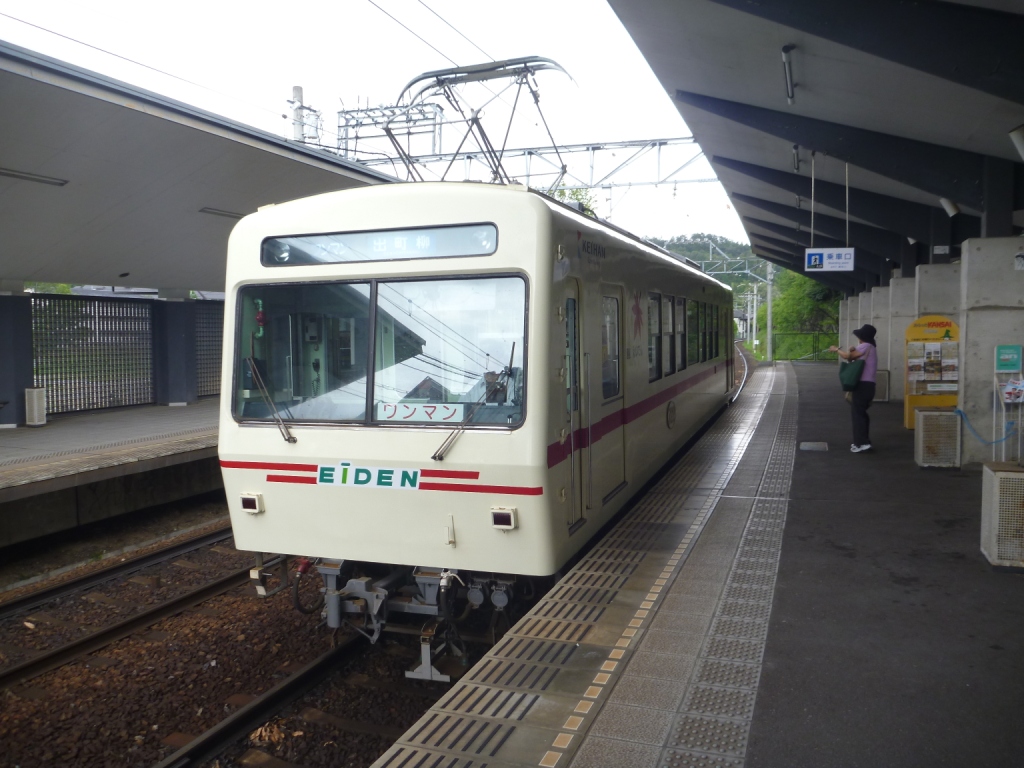 地下鉄から急坂、急カーブを乗り越えてきた京津線電車。