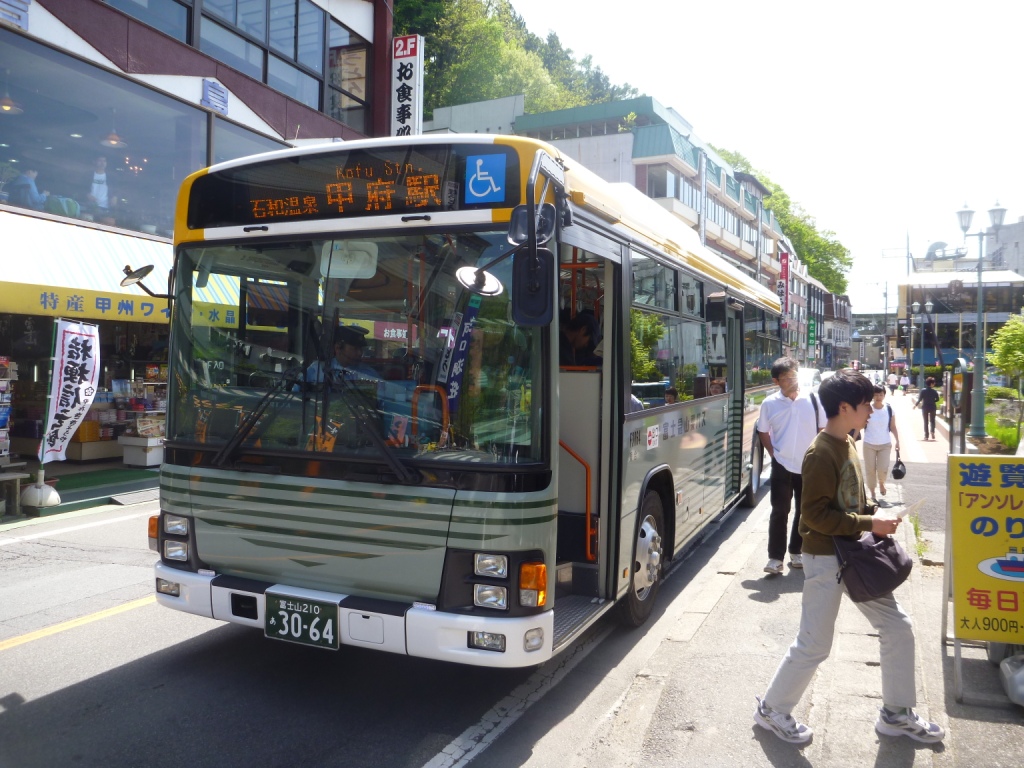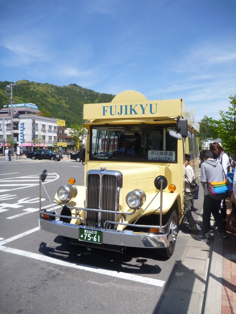 午後は河口湖の遊覧船に乗るべく、レトロバスで湖畔に向かいます。