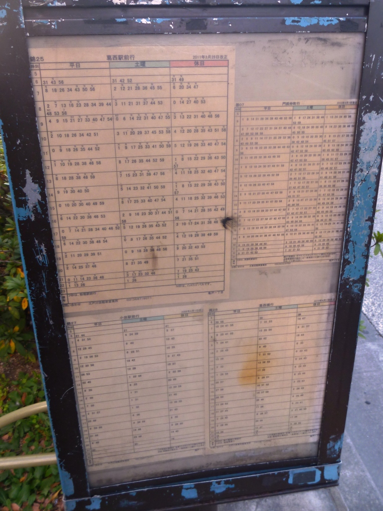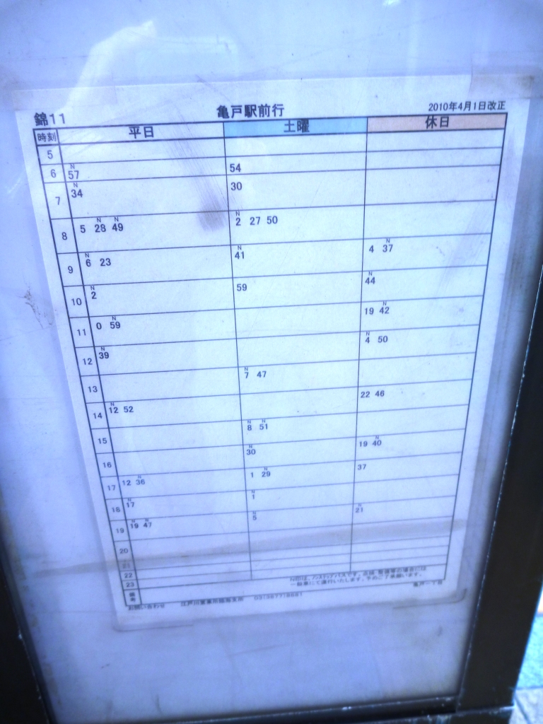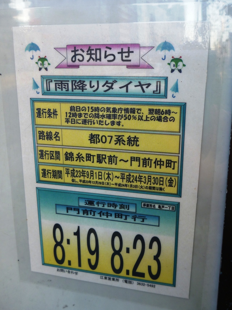 ▲時刻表も実に9枚。雨降りダイヤは数年前に数系統で始まった取組です。@亀戸一丁目