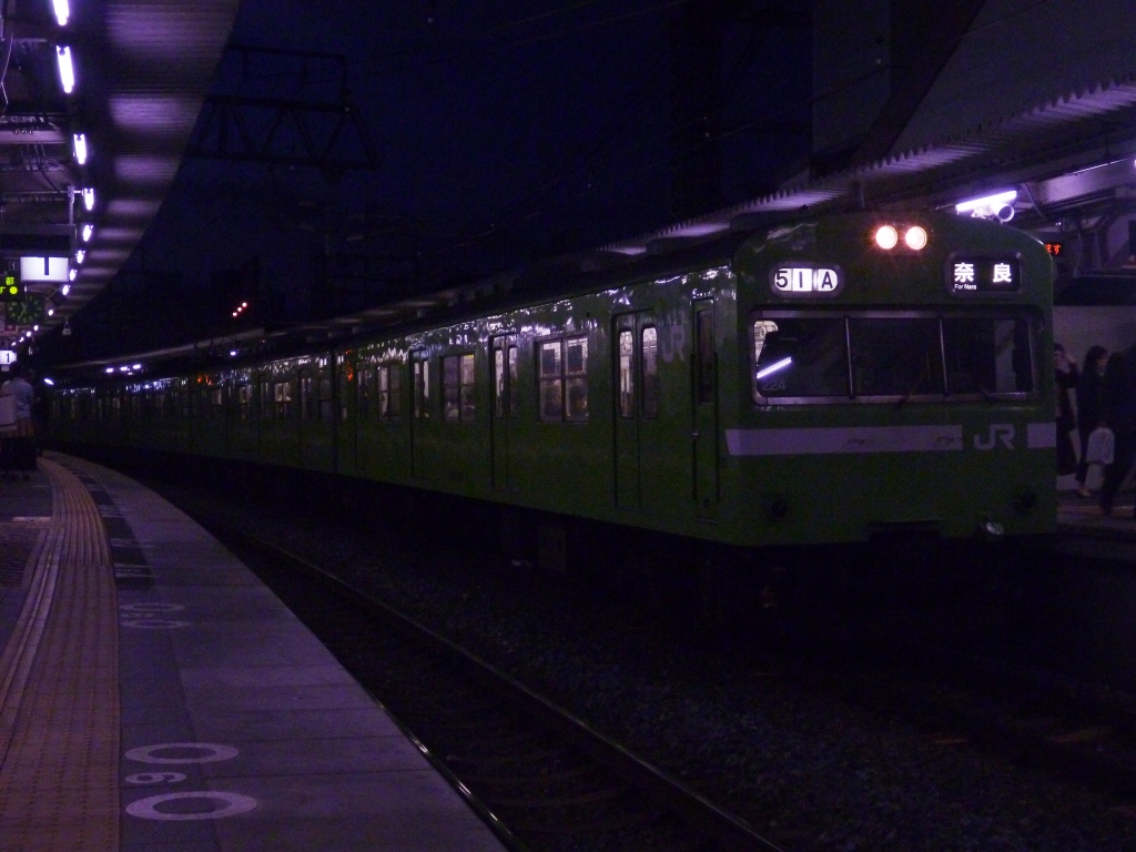 ▲真っ暗な中、対向車両の撮影に挑戦。関西は相変わらず国鉄車の楽園ですね。@東福寺