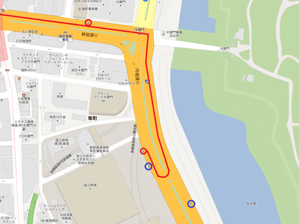 ▲上に見える赤丸が半蔵門停留所([都03][宿75]三宅坂方面)、下に見える丸は三宅坂停留所。