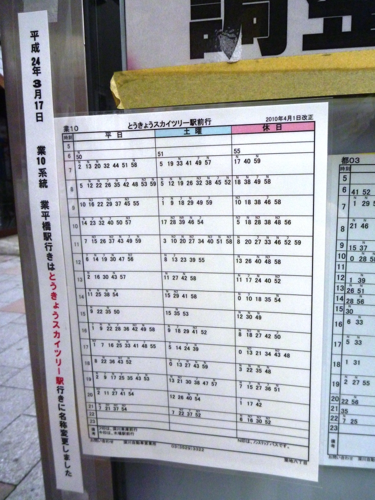 ▲スカイツリー表記の現行時刻表。ガラスケースの中には「業平橋」表記のものも…。@築地三丁目