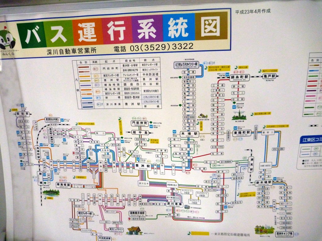 ▲深川営業所の路線図。ダイヤ改正と共に所管系統も変更になるので、ほぼ確実に張り替え。